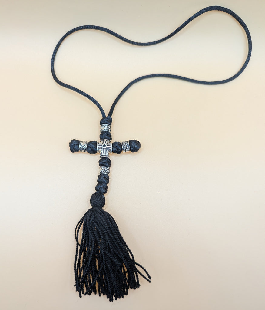 Handmade by the nuns at Samtavro Monastery, in Mtskheta, Republic of Georgia where St. Gabriel Urgebadze was Archimandrite. These hanging crosses, suitable for display on a rear-view mirror, have already been blessed on the relics of St. Gabriel Urgebadze and the Robe of Christ.