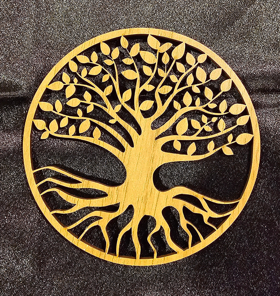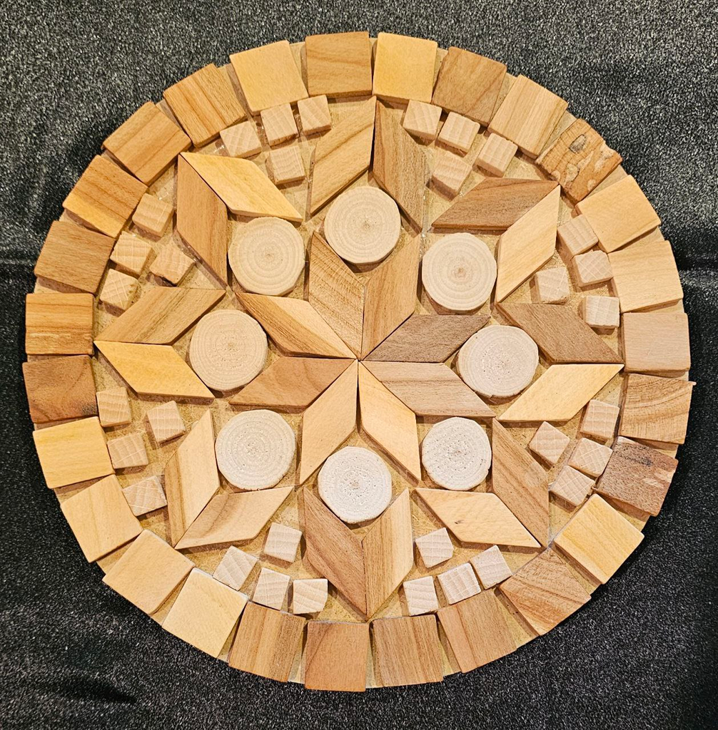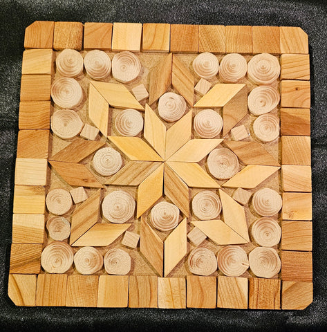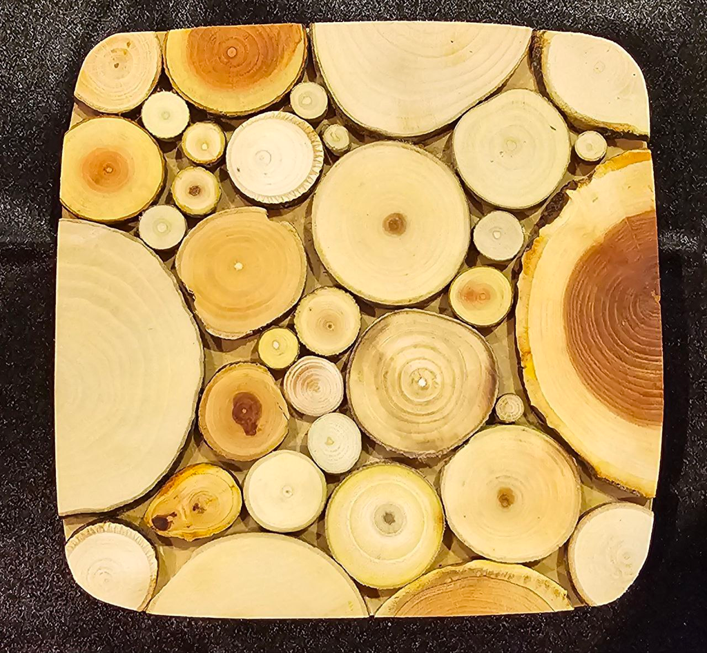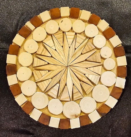 This coaster is made traditionally in Hutsul region in the Carpathian mountains, where masters of their craft make products in the national style to improve the quality of everyday life. There is the Carpathian juniper on the bottom part of the product, and when heated this coaster emits a pleasant smell of juniper. Thin branches of juniper wood are used, which makes the table mat especially beautiful. Sackcloth, on which the pattern is attached, is glued to the upper side of the fabric. In this case two sunflowers are in the frame of the small squares of dark wood. The master uses a different wood, which differs in color. This technique makes the pattern much more beautiful.