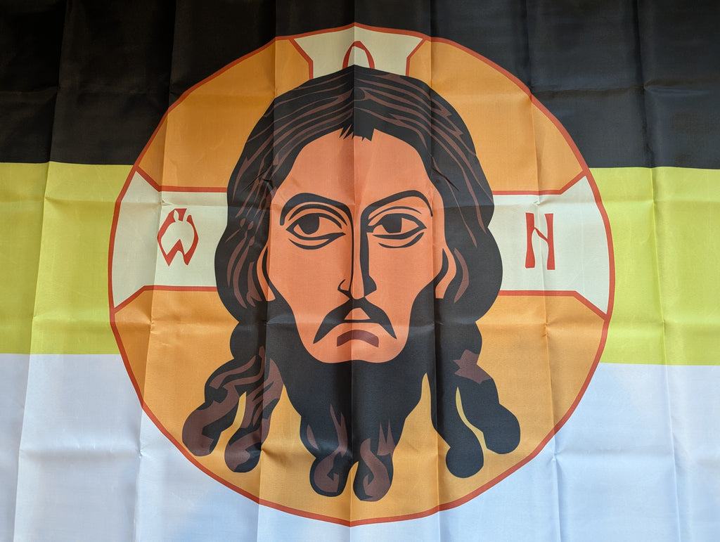 Icon of Christ Not-Made-by-Hands superimposed on the 1858-1896 Russian Imperial State flag.