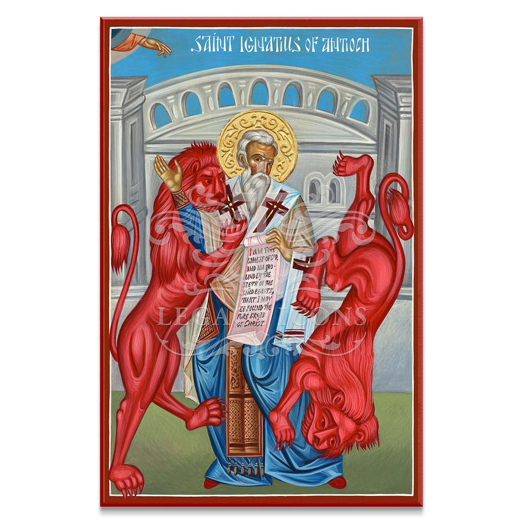 St. Ignatius was sentenced to death in the Roman Colosseum, to be eaten by lions. He went joyfully to his death around the year 110, with the name of Jesus on his lips and in his heart. This icon depicts his willing martyrdom in the arena.